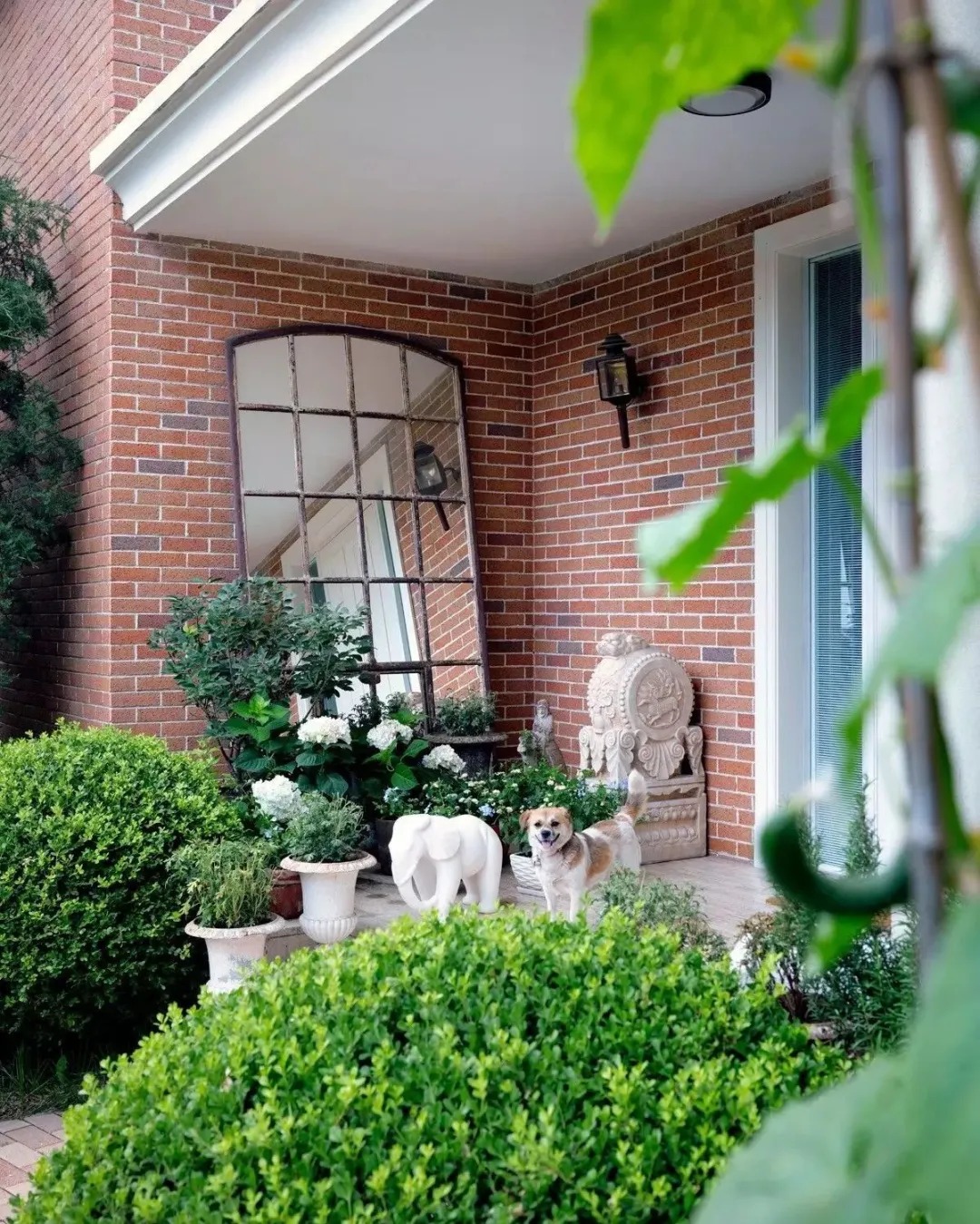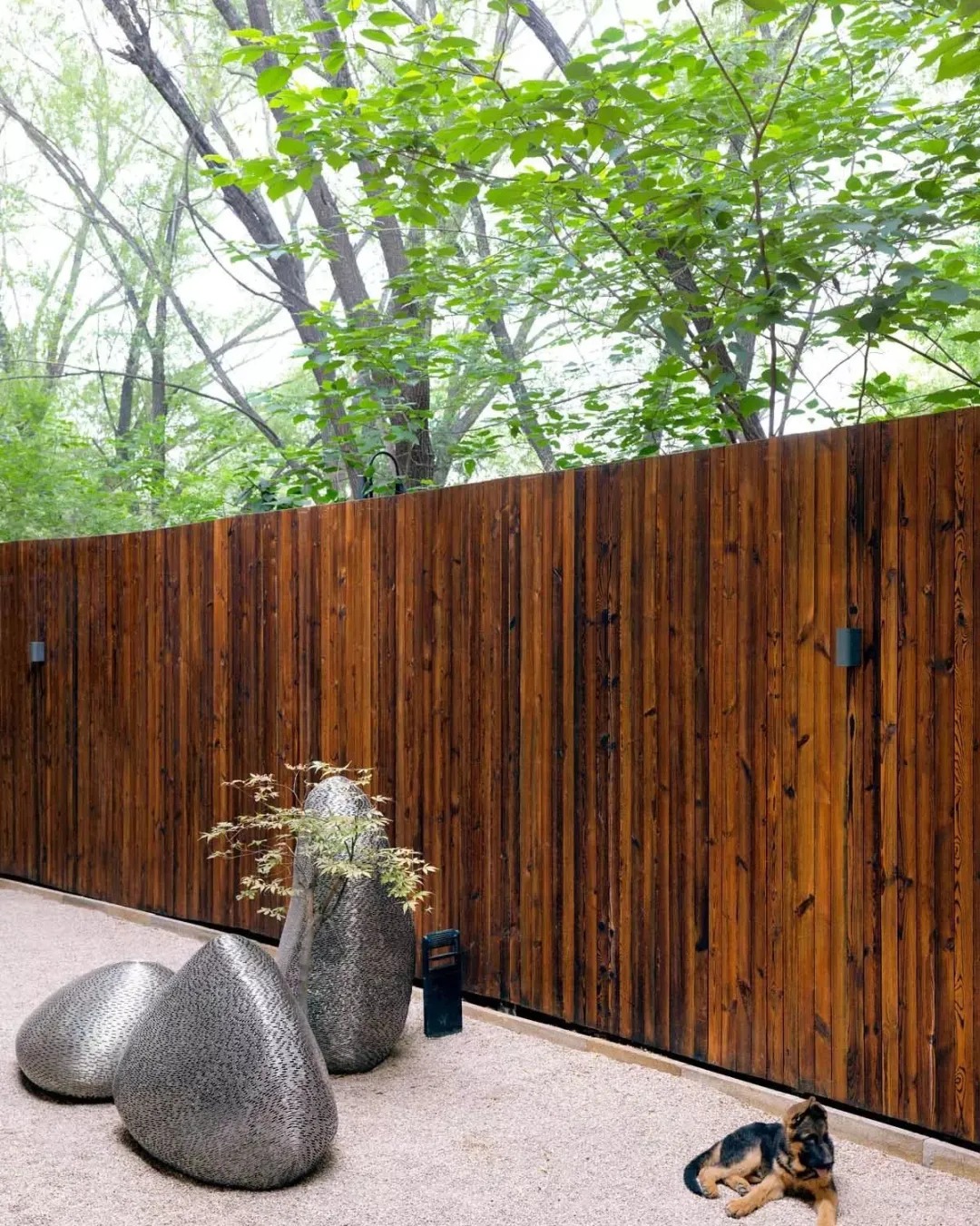院墻內(nèi)一景,是日式枯山水的樣貌,墻外綠蔭蔭的綠葉都忍不住探過頭來偷窺。作為愛狗人士的張靜初,狗狗當(dāng)然是家里重要的家庭成員。