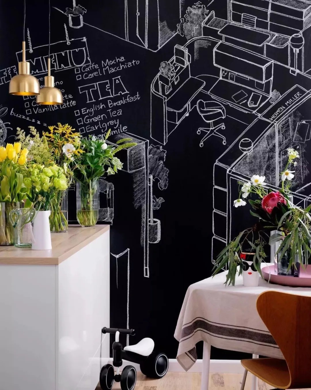 餐廚處的涂鴉墻,是特意為家人和朋友設(shè)計(jì)的,黑板墻上寫著可以提供的食物與飲料,黑板也能滿足女兒涂鴉的樂趣,同時(shí)也是家人、朋友間互相留言的情感交流處。