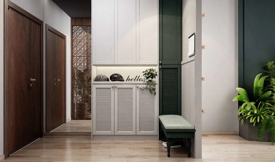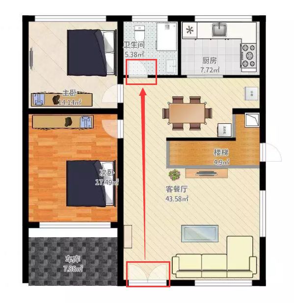 如果戶型空間允許,如下面戶型圖這樣,可以在入門區(qū)域做各式隔斷遮擋形成入門過(guò)渡區(qū)域,既解決了入戶門正對(duì)衛(wèi)生間門的問題,也解決了私密性及換鞋收納的問題,是個(gè)一舉多得的辦法。