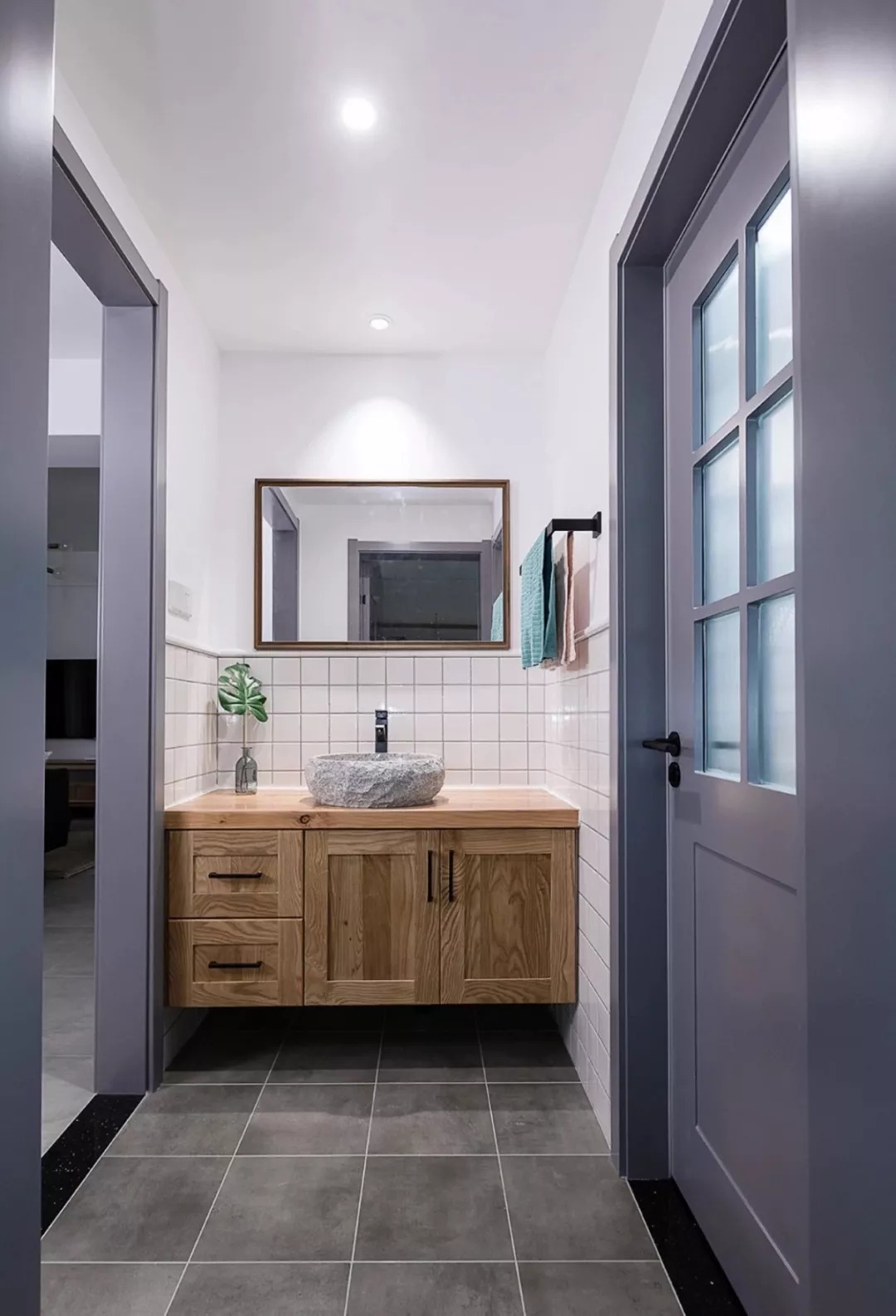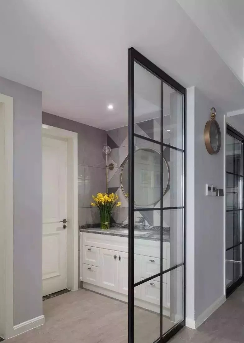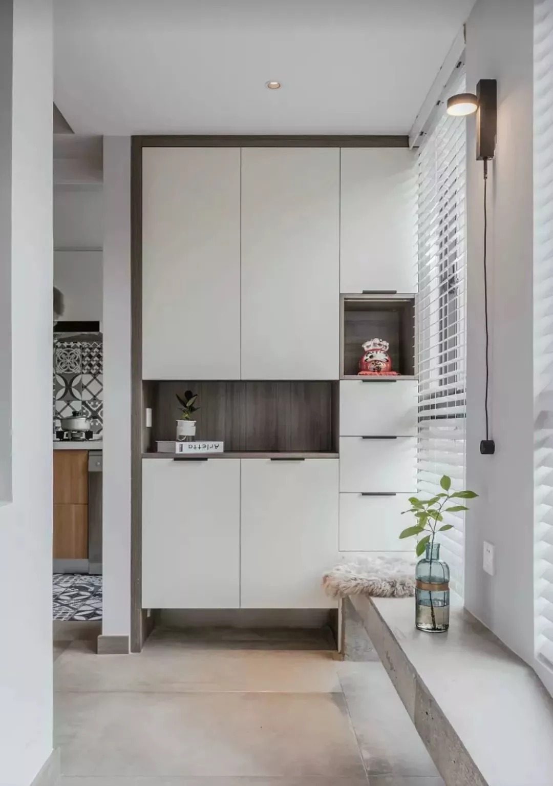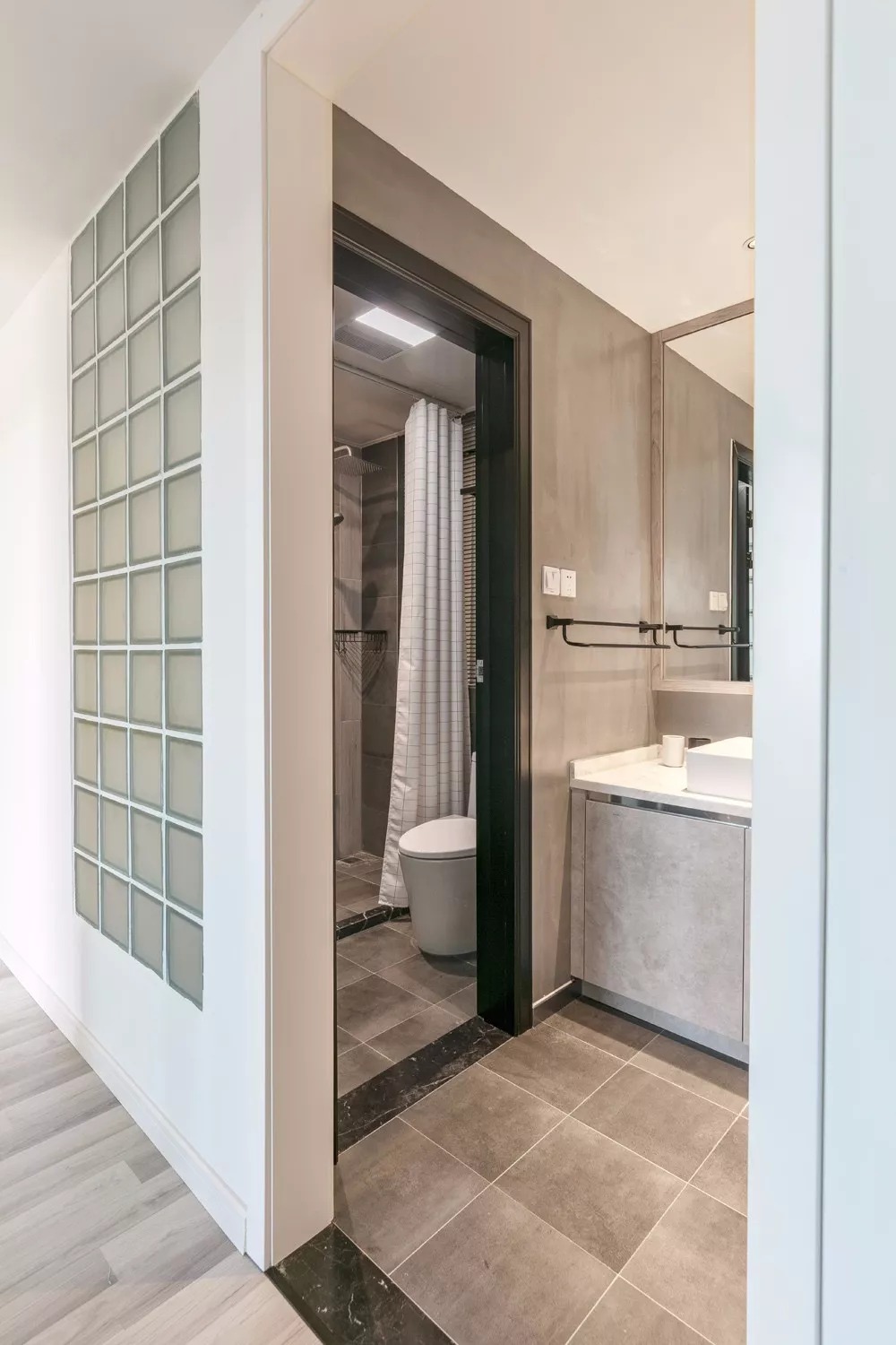 如果入門區(qū)域沒有更多的空間來(lái)設(shè)計(jì)隔斷,可以考慮將衛(wèi)生間的洗手臺(tái)外移,減少日常進(jìn)出衛(wèi)生間的次數(shù),而且洗手臺(tái)外移,能起到一定的遮擋,視覺上起到一定的緩解作用。