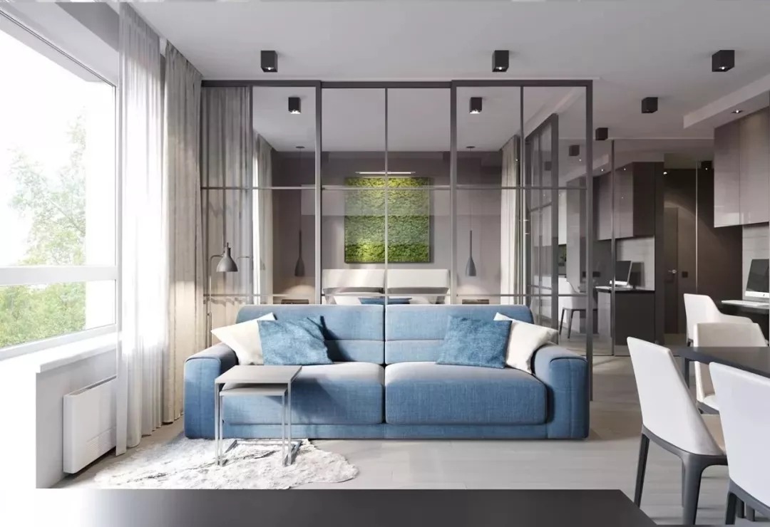 時下流行的隔斷形式有很多,黑框玻璃門是非常理想的功能分區(qū)的辦法。它時尚、精致、“隔而不斷”,而且會讓整個空間都有明亮通透的感覺。