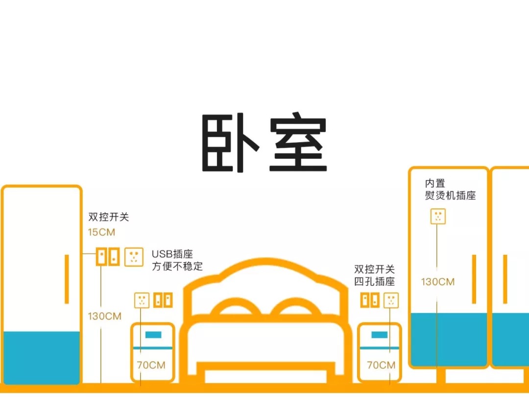 2、床頭插座:床頭兩邊各安裝1個帶USB的五孔插座,高度和地面相距70cm,方便手機和床頭燈充電使用;