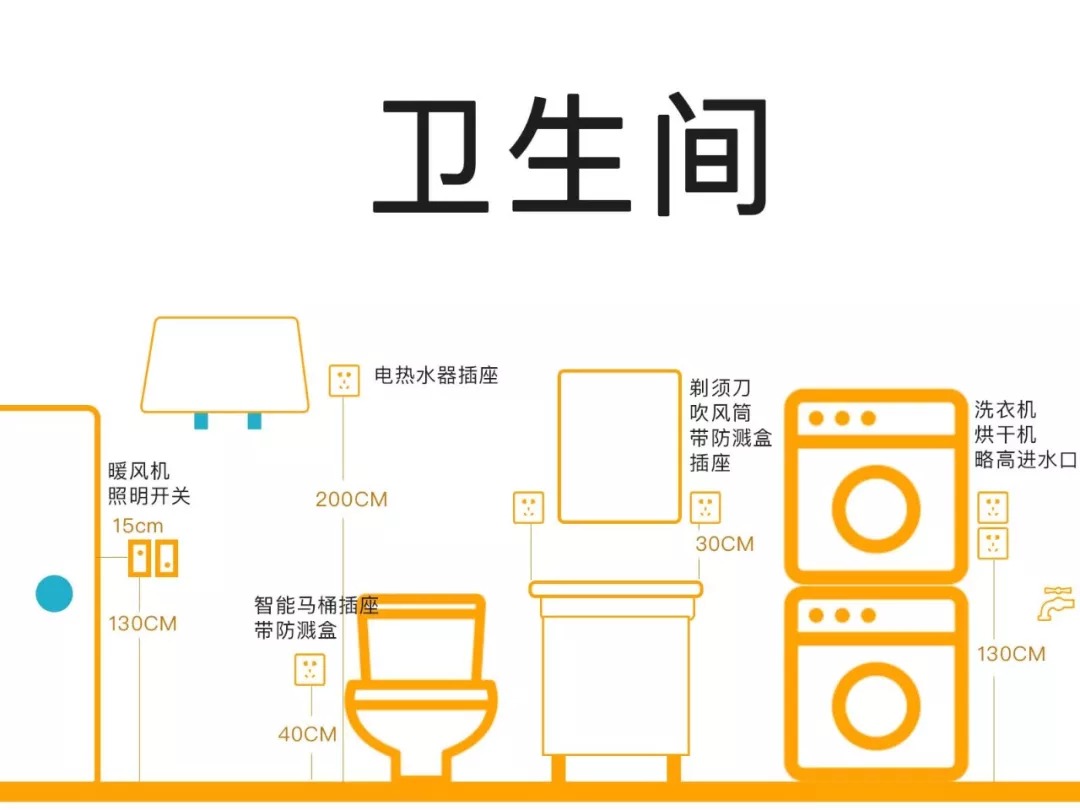 3、洗衣機:洗衣機插座一般和地面相距130cm,插座高度要比出水口高一點;