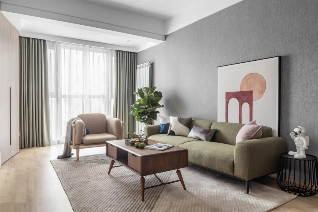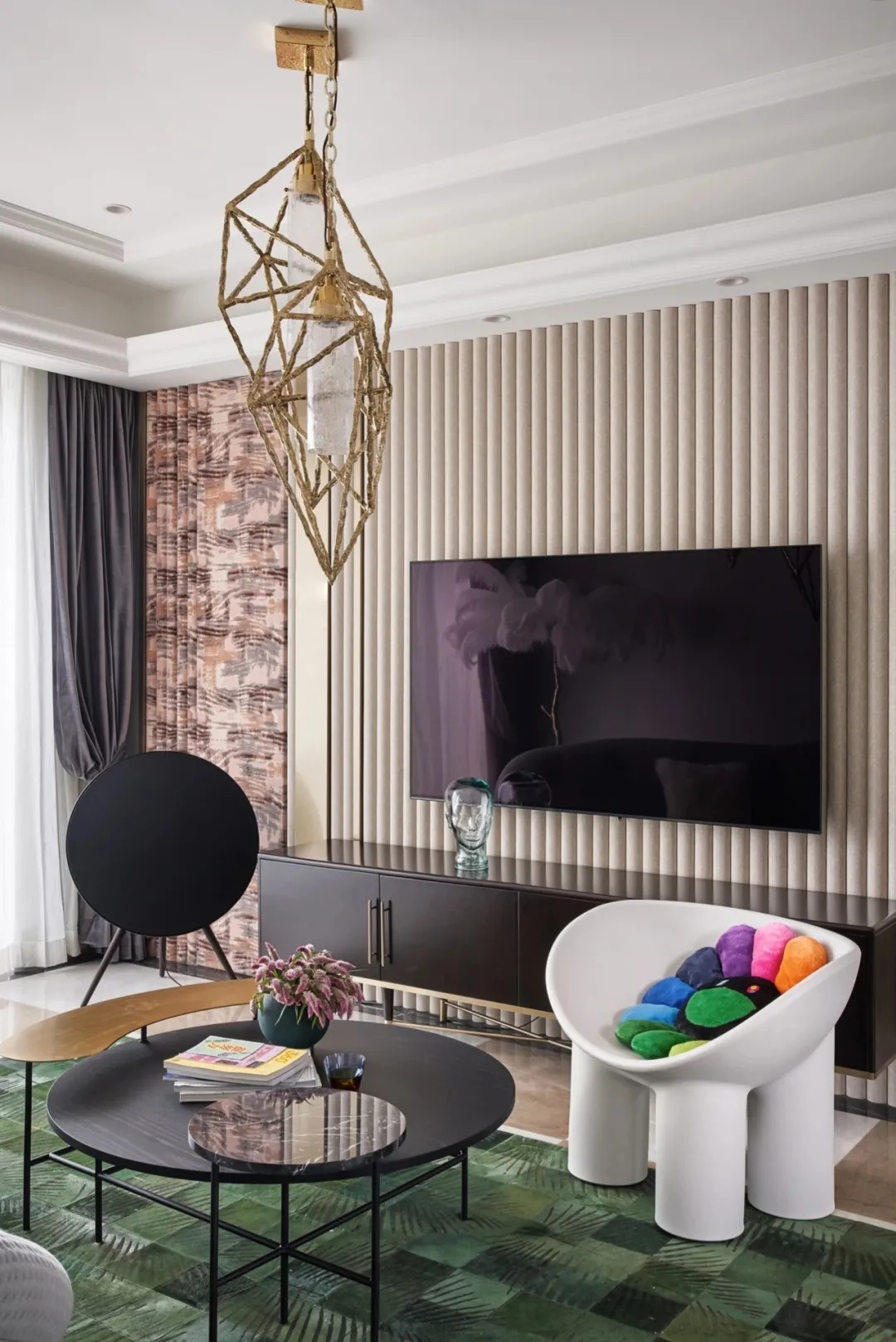 上下分色設(shè)計(jì)同樣用在了窗簾和電視背景墻上,配上黑色電視機(jī)更具層次感。