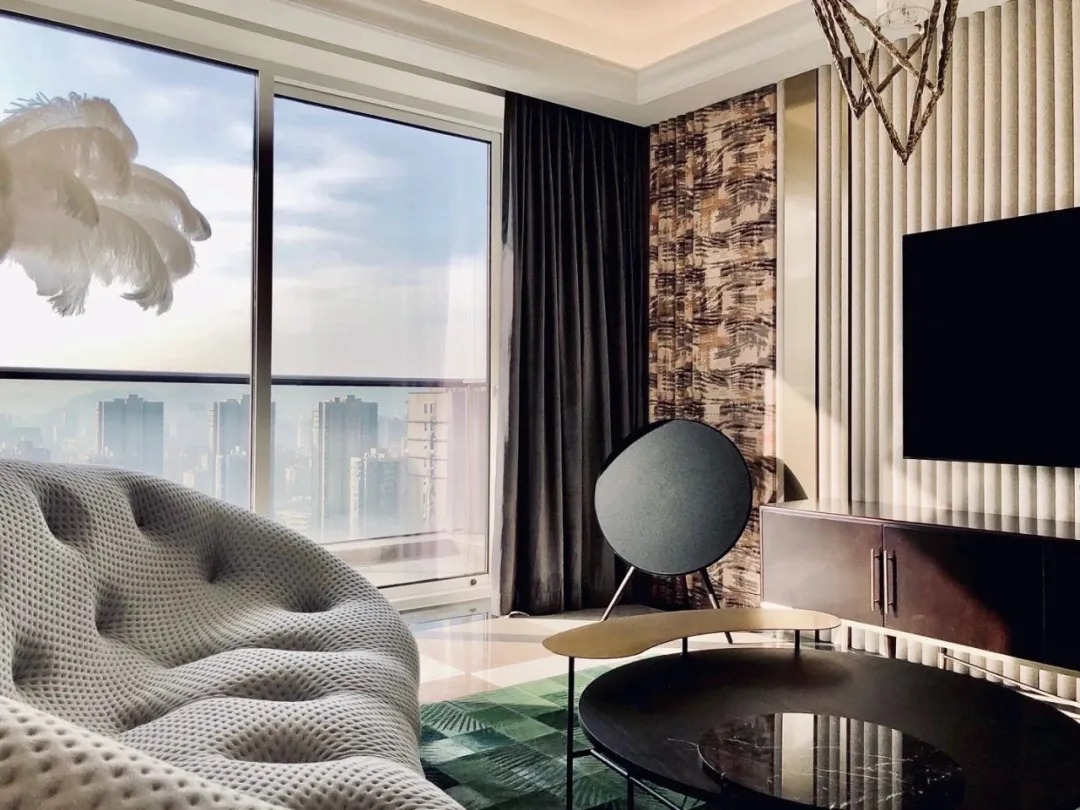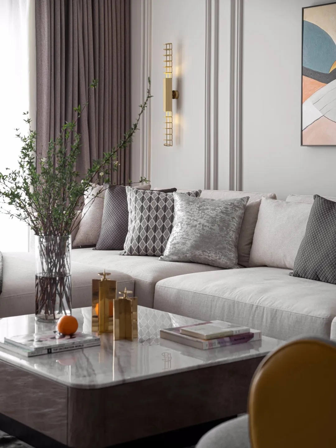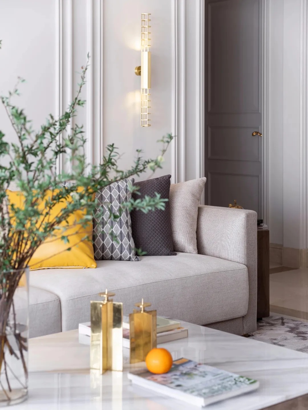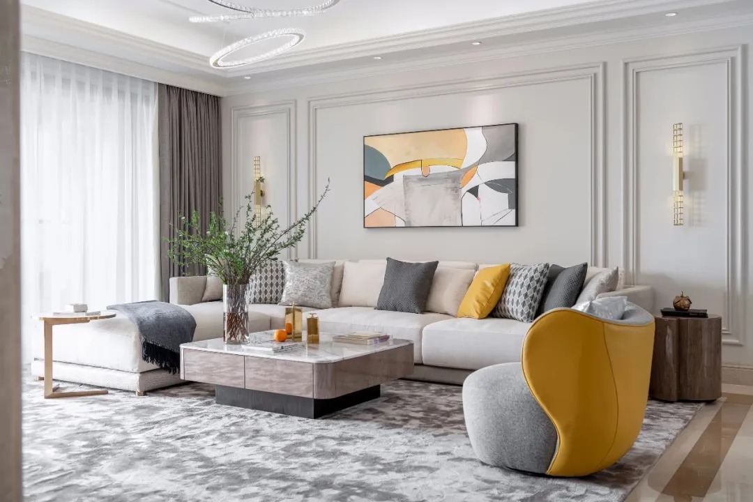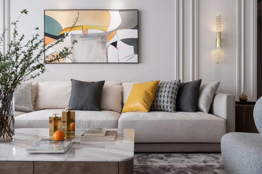 客廳主色調(diào)以暖調(diào)黑白灰取代原有的空間底色,同時(shí)點(diǎn)綴芒果黃,清晰明快,金色則賦予空間優(yōu)雅輕奢的質(zhì)感。