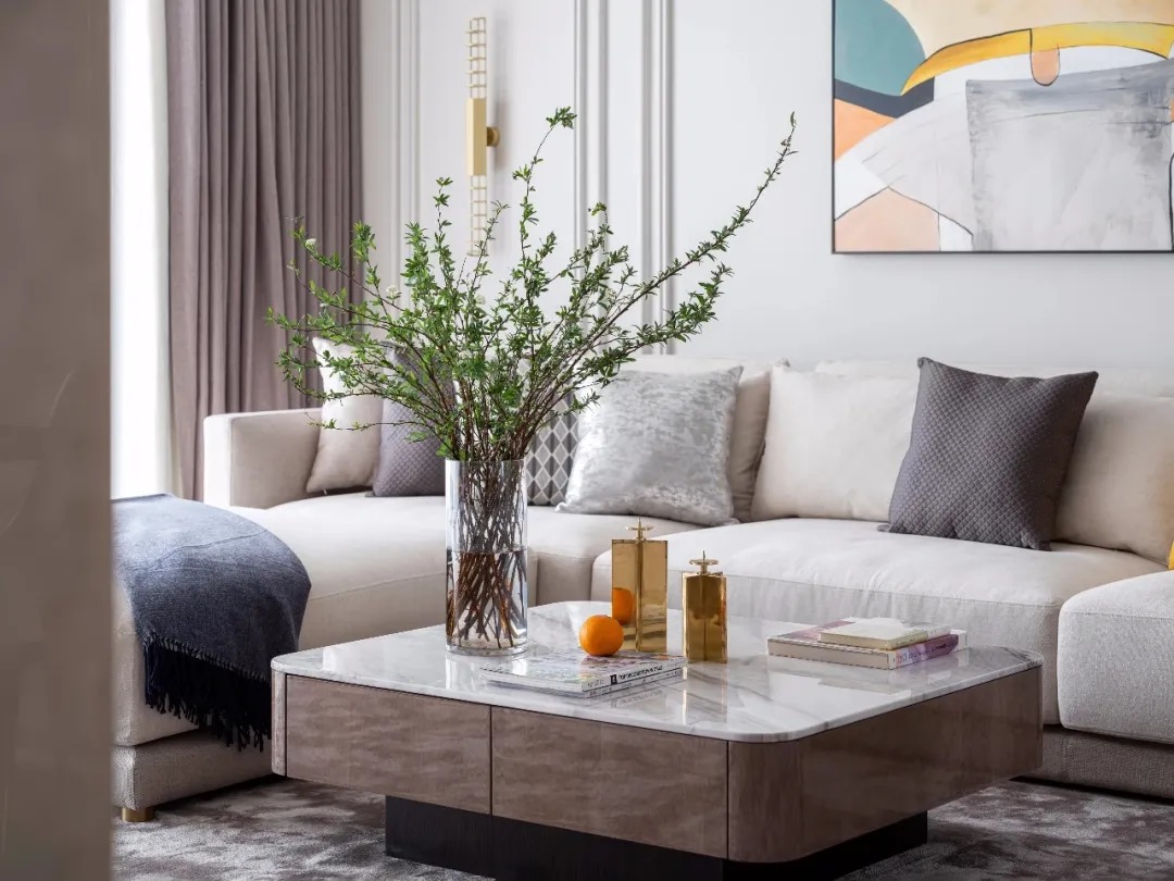 大理石材質(zhì)茶幾自帶輕奢質(zhì)感,與咖啡色搭配精致簡雅而不清冷。精心安插的花藝充滿藝術(shù)感,花葉清芬搖曳,彌漫一室清香。