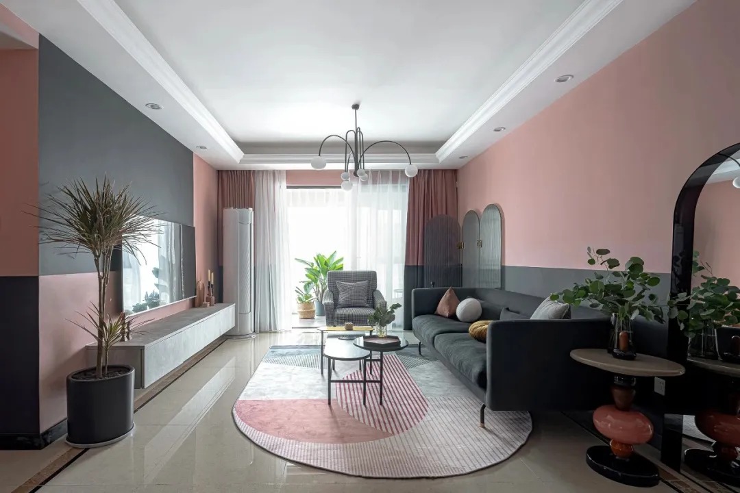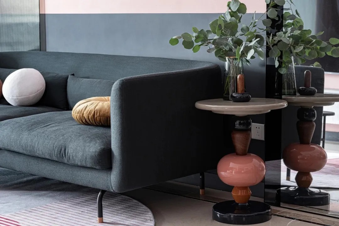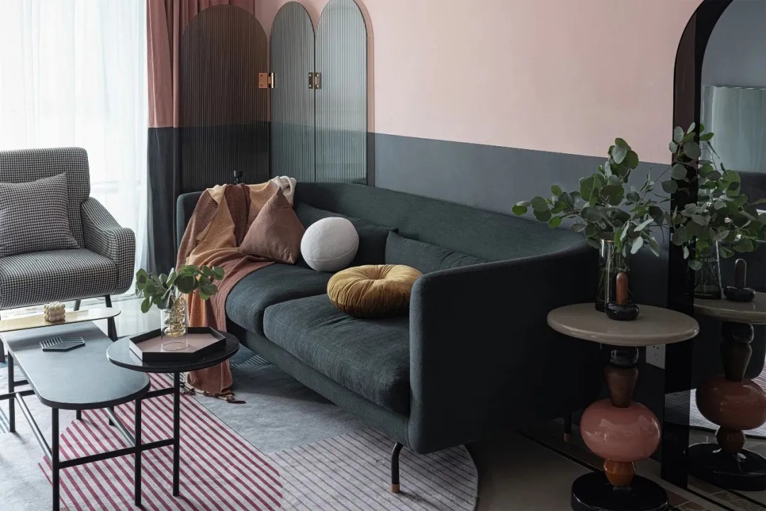 通過黑與粉的極致分色,搭配藝術(shù)玻璃,呈現(xiàn)出別具一格的效果。弧形的淺灰色亞克力屏風(fēng)和弧形的落地鏡形成對(duì)稱呼應(yīng)的關(guān)系,空間既有上下分色墻面又有左右對(duì)稱形狀,因此并沒有常規(guī)的掛畫設(shè)計(jì),讓空間設(shè)計(jì)適當(dāng)?shù)淖鰷p法,避免畫蛇添足的作用,增加陳設(shè)高級(jí)感。
