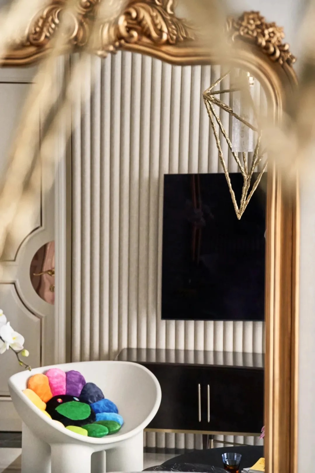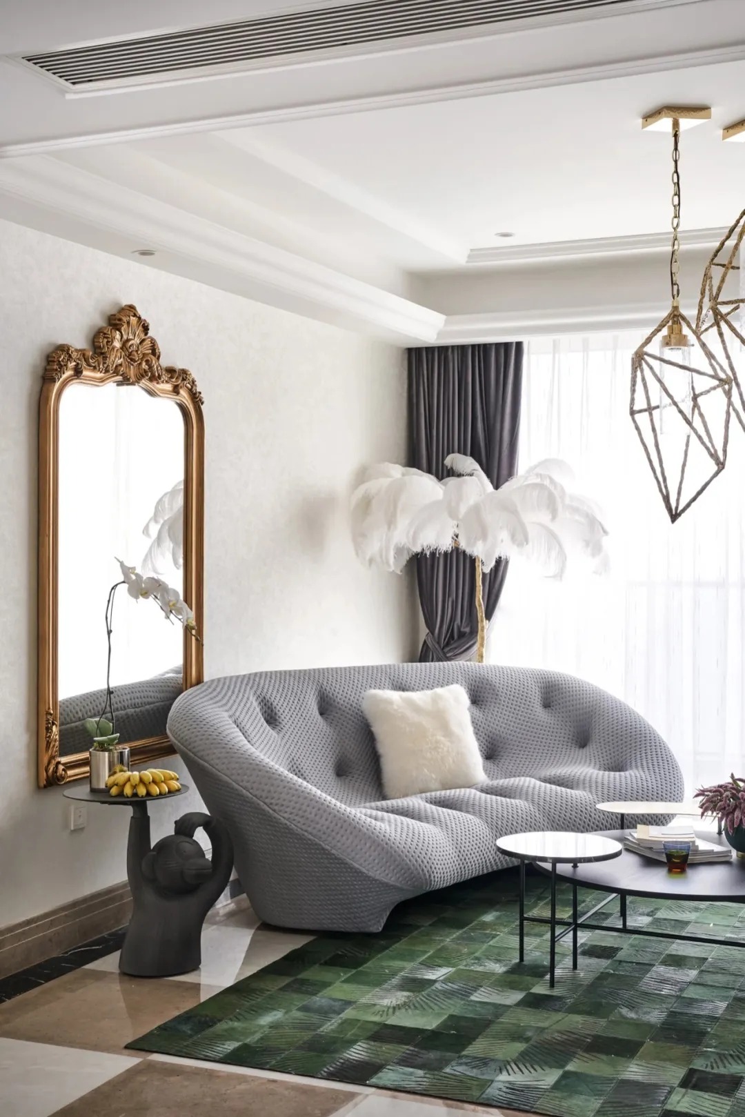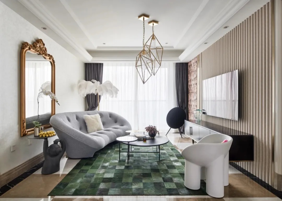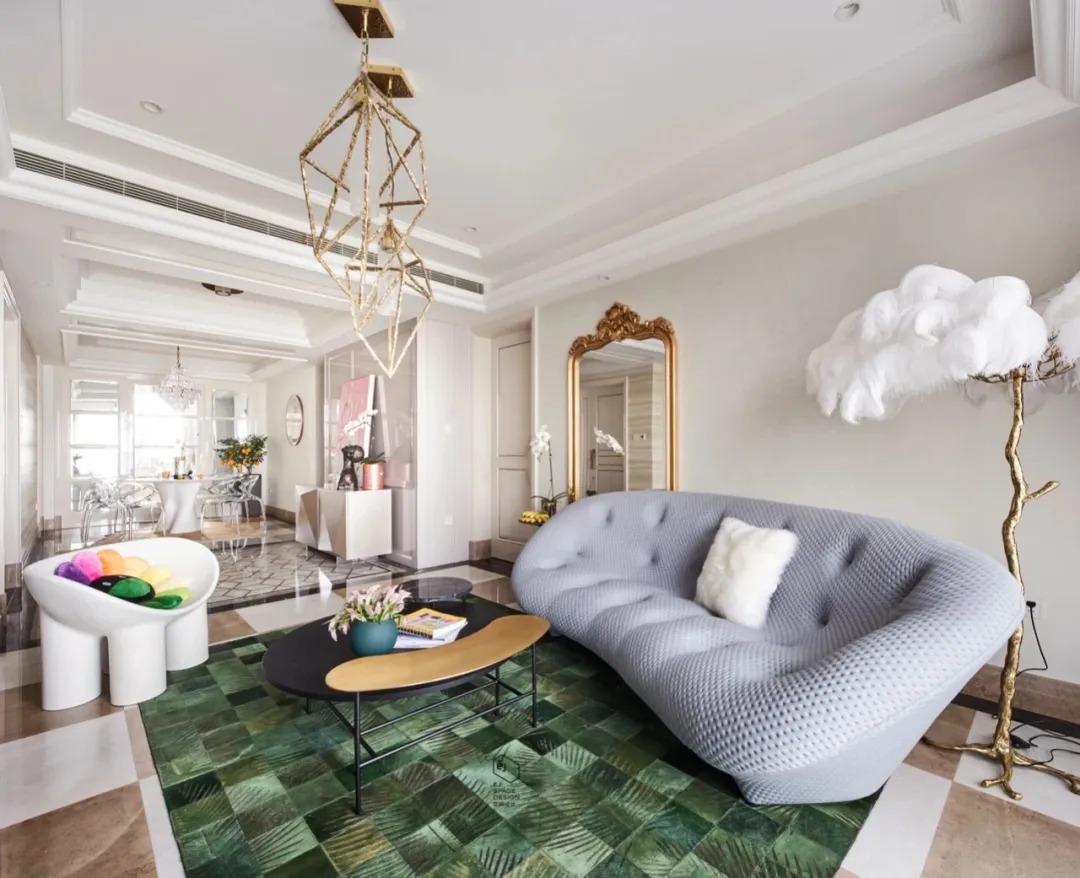 保留了原房地磚,整體色系以白色、奶咖為主,與地磚風(fēng)格也比較契合。淺灰色沙發(fā)時(shí)尚且舒適感十足,搭配熱帶雨林元素地毯,奢華的祖母綠帶來春意,讓人卸下一身疲憊,寧靜而美好。一面大尺寸巴洛克風(fēng)格裝飾鏡輕松解決乳白色背景墻帶來的單調(diào)感,精美的雕花,提升空間的奢華感和藝術(shù)氣質(zhì),又?jǐn)U大了視覺效果,營造亦真亦假的夢幻感受。羽毛裝飾、趣味邊幾、巴洛克吊燈,精致到每一處細(xì)節(jié),與個(gè)性時(shí)尚的家居氛圍十分契合。