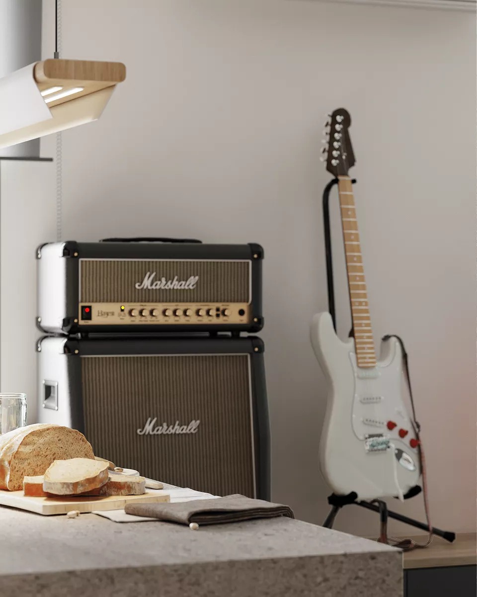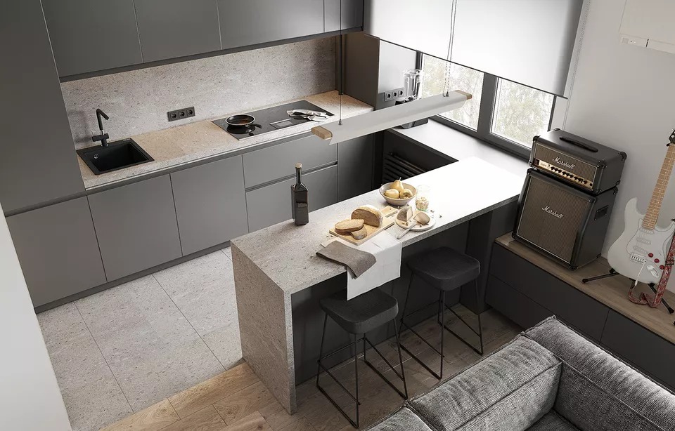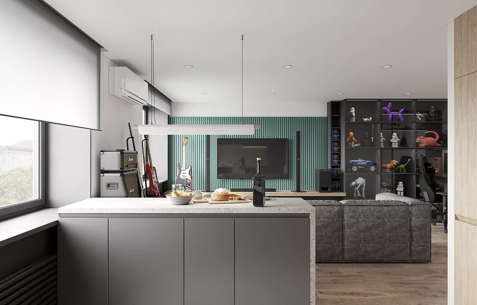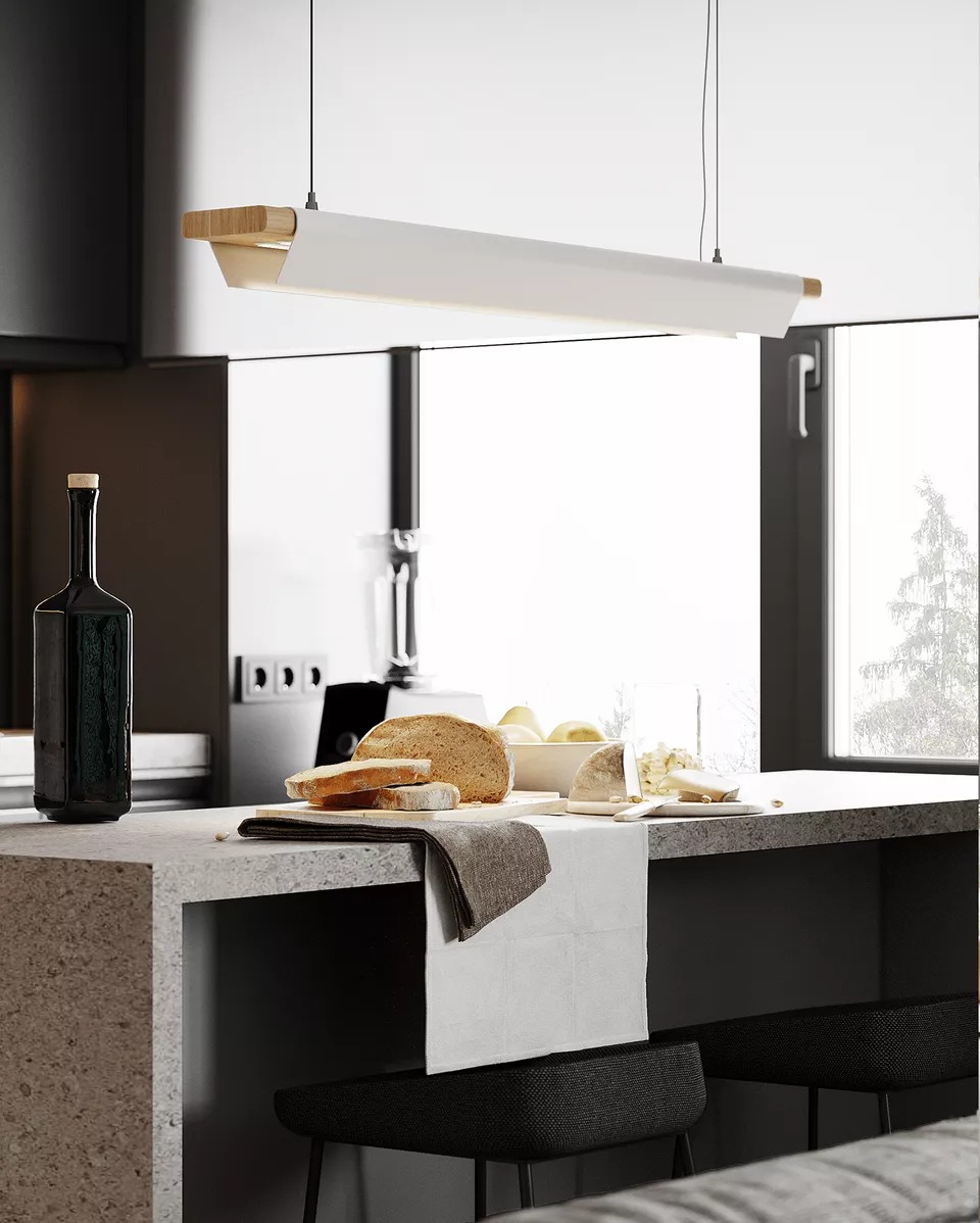 搭配白色臺面、原木柜,深淺搭配,色調互補。