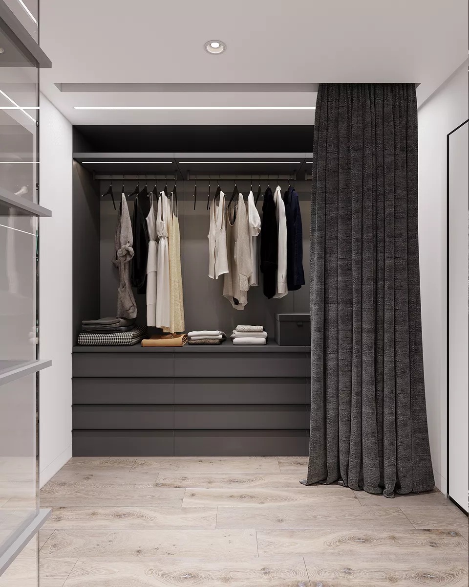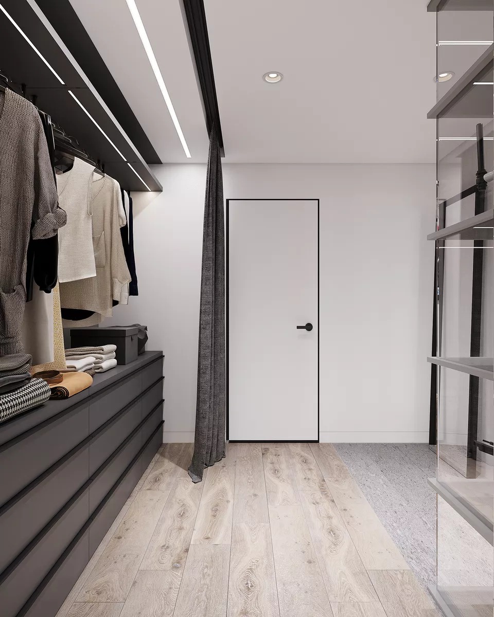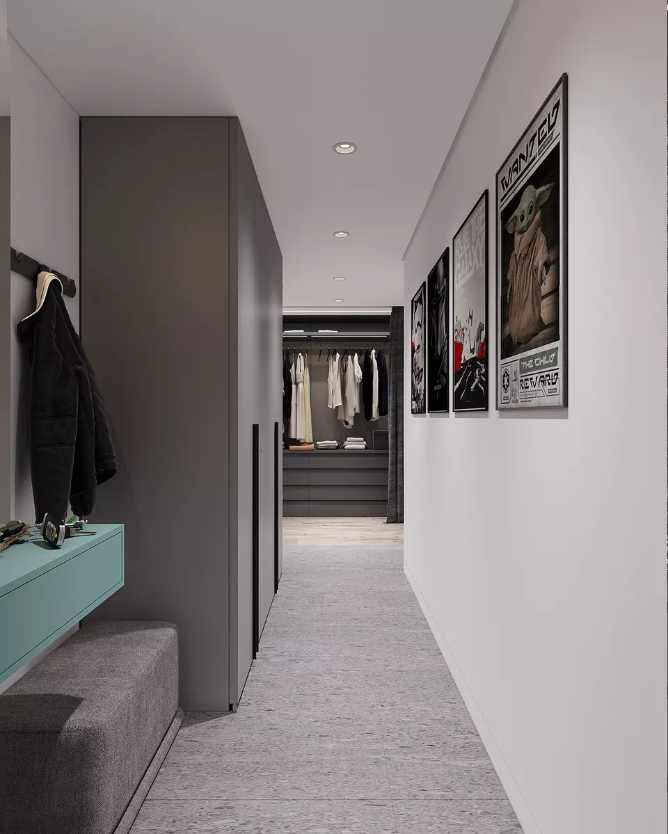進門坐凳簡潔、舒適,所有收納移交至右側衣柜,鞋、包包、配件等都可放里面。