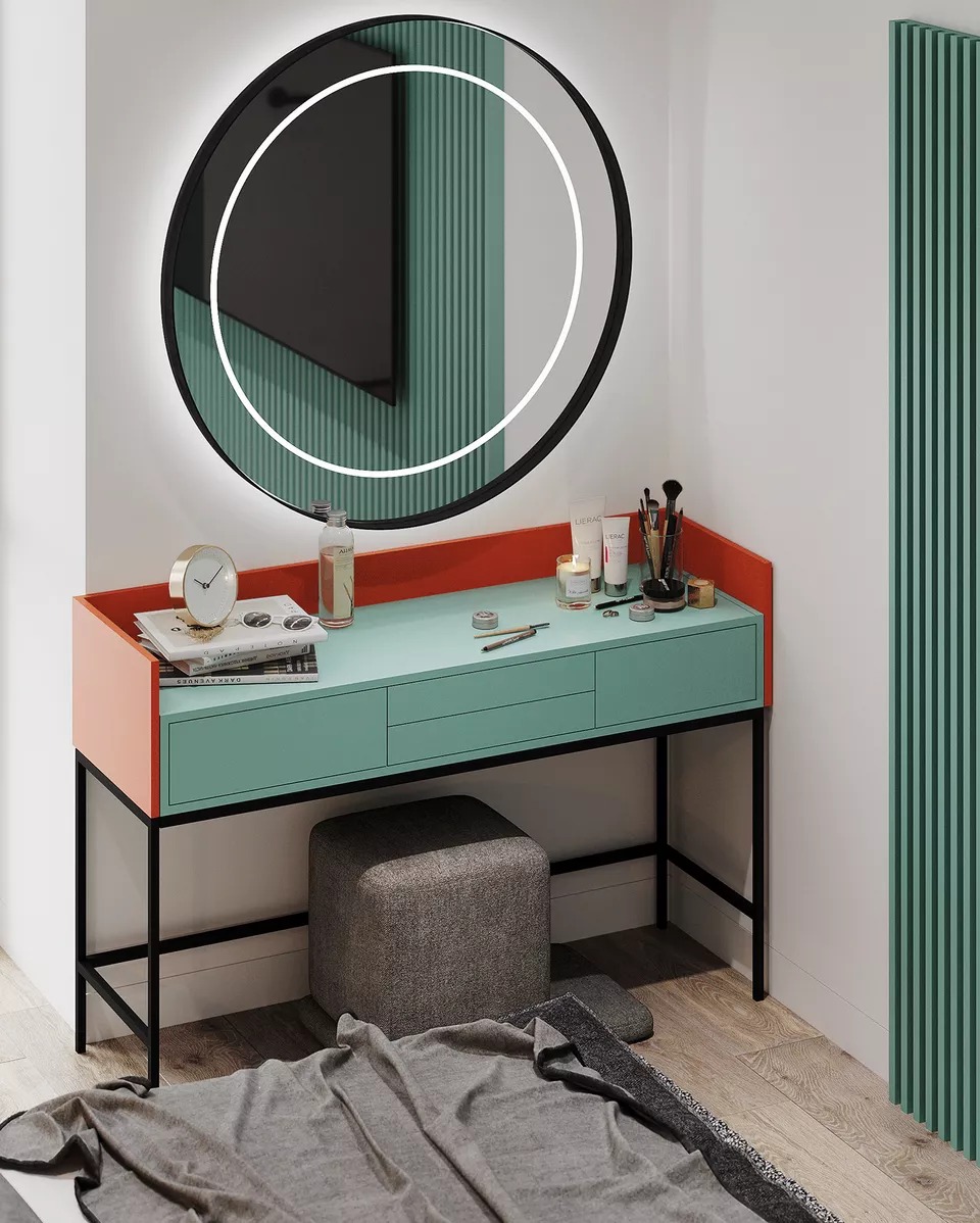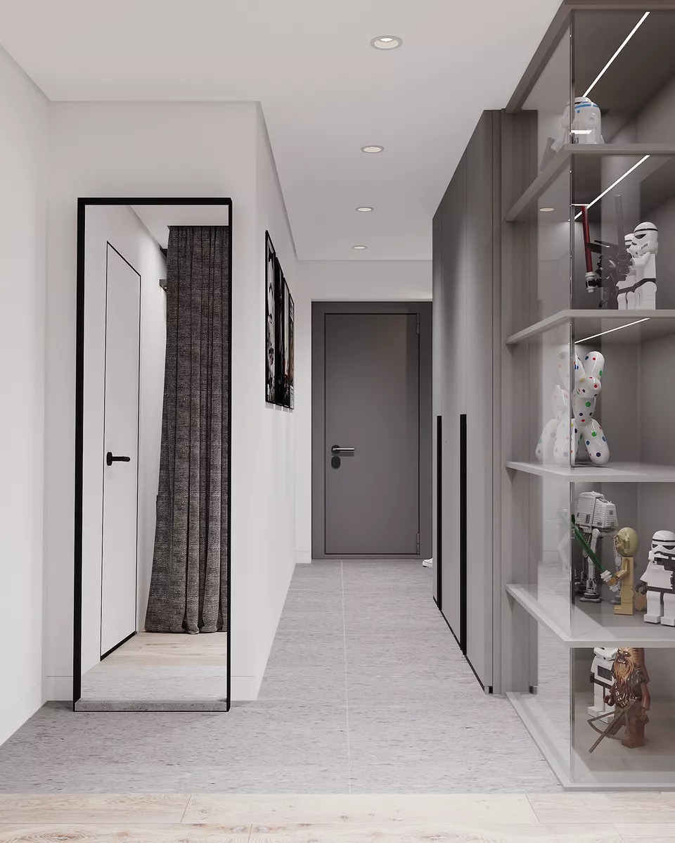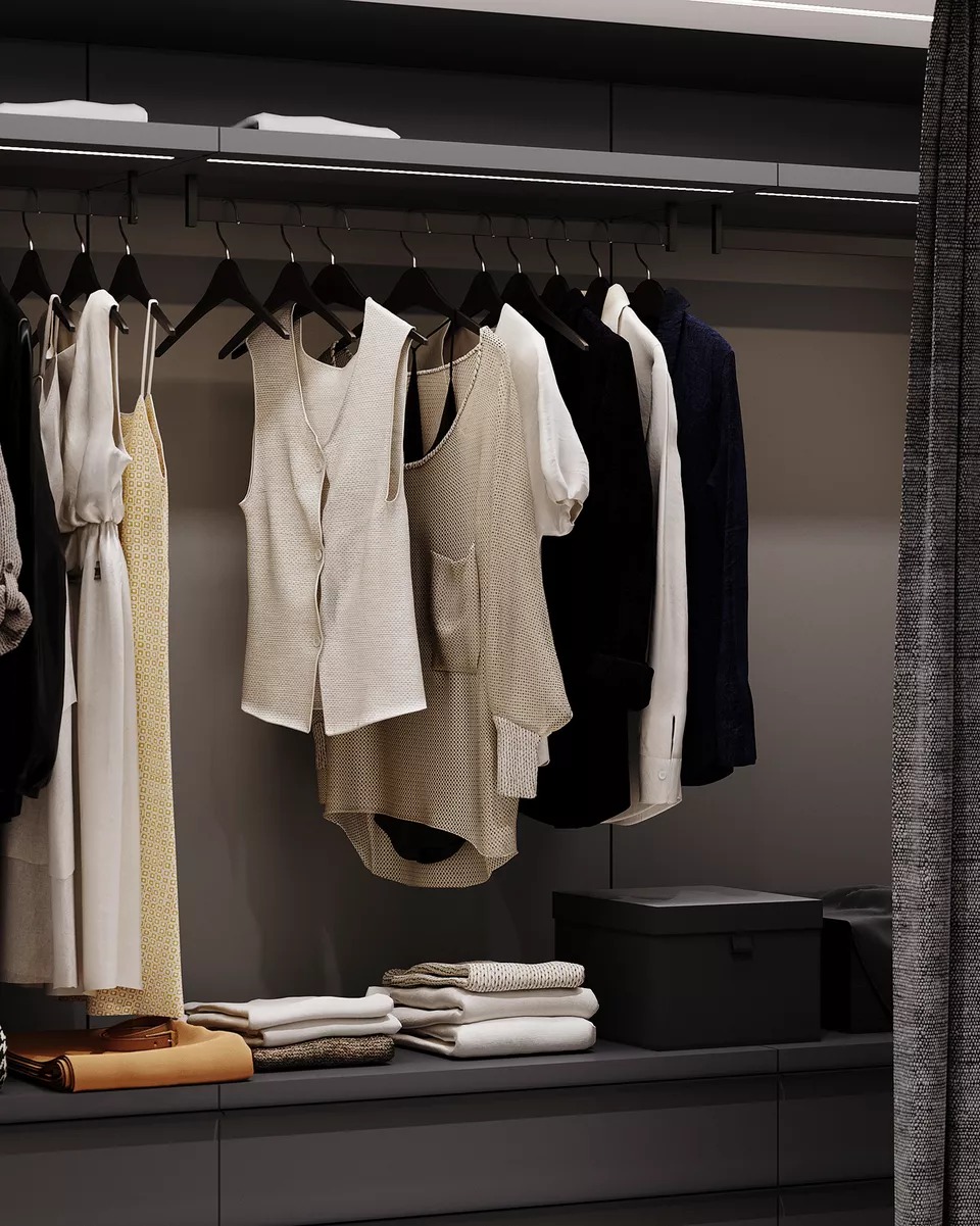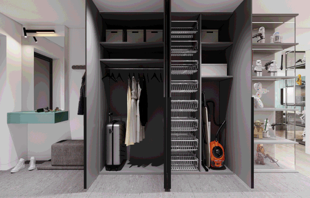 進門坐凳簡潔、舒適,所有收納移交至右側衣柜,鞋、包包、配件等都可放里面。