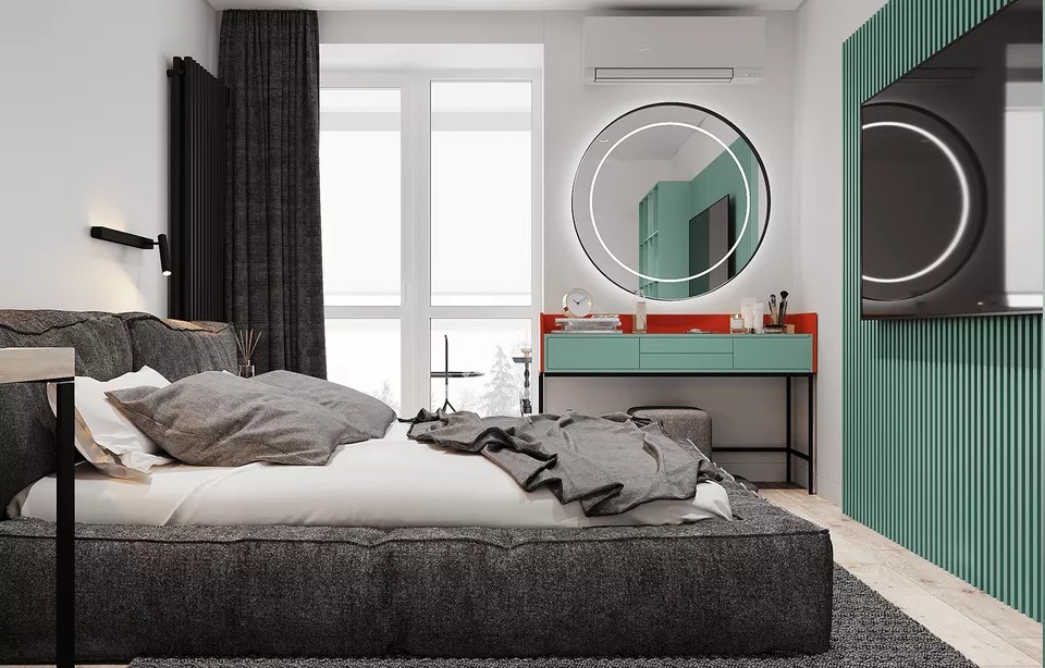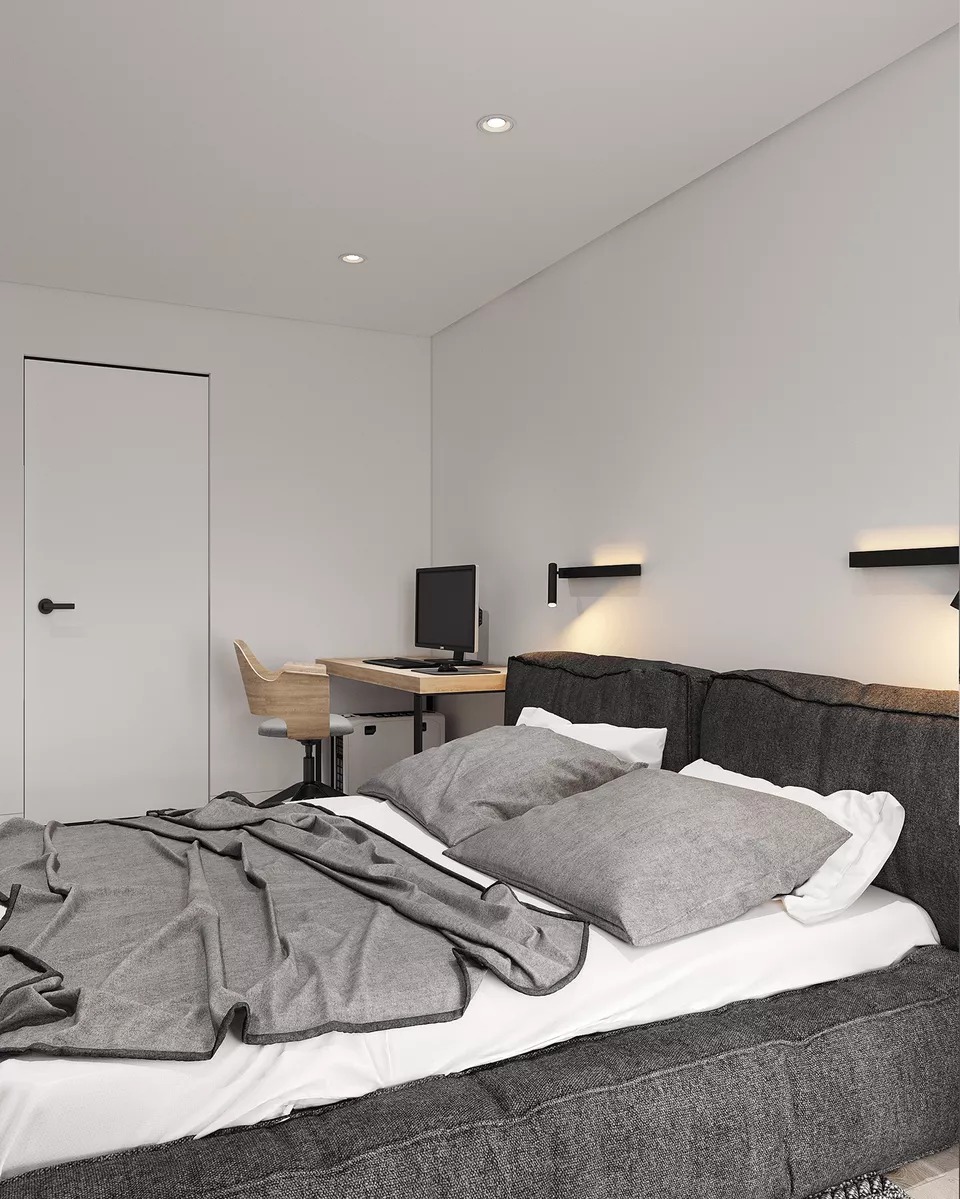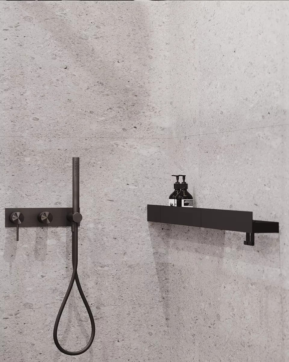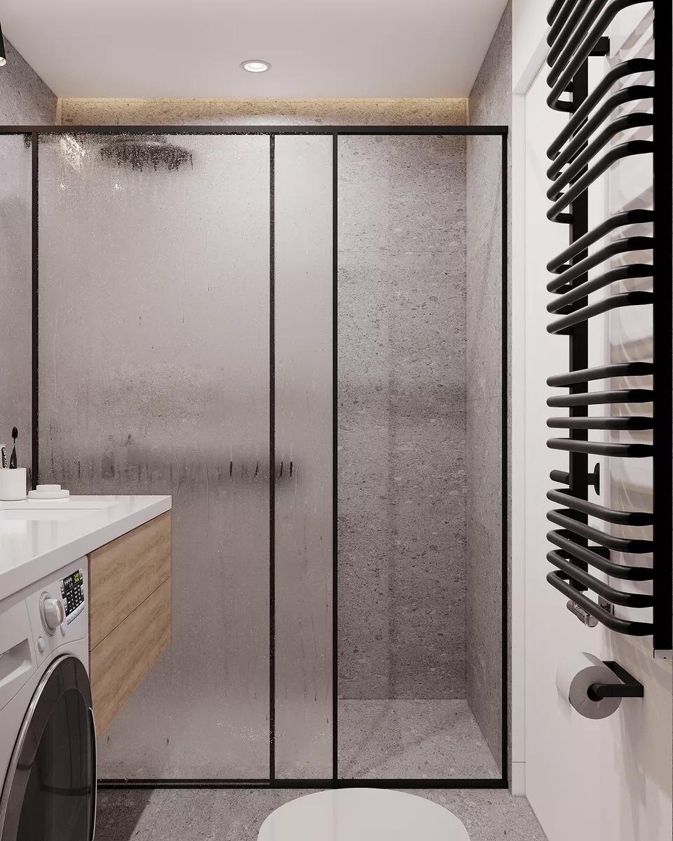 衛(wèi)生間以大面積的磨砂灰為背景,