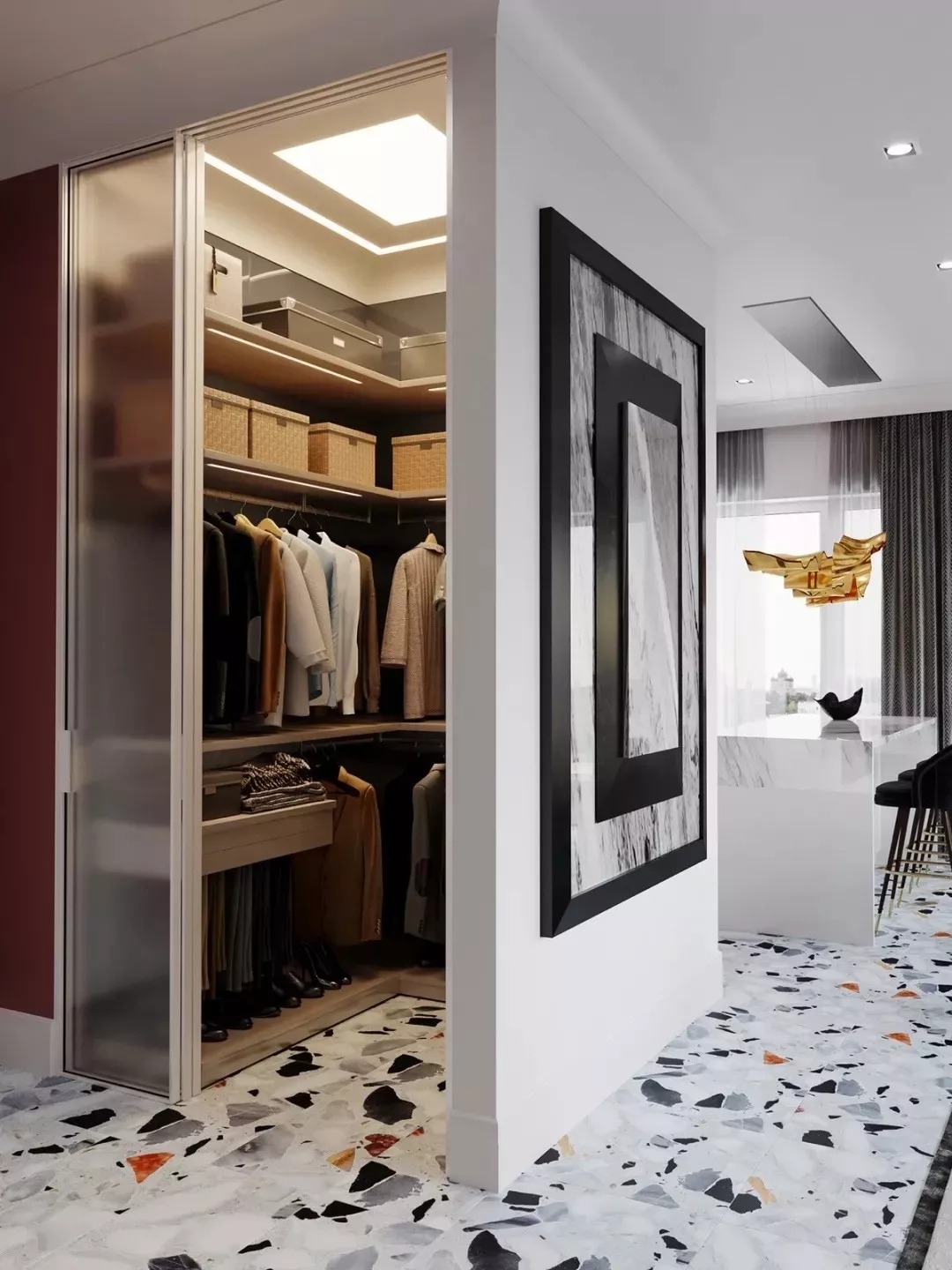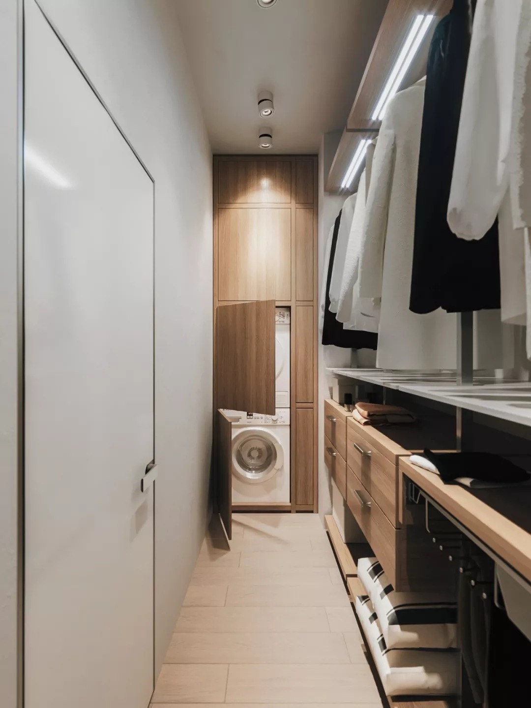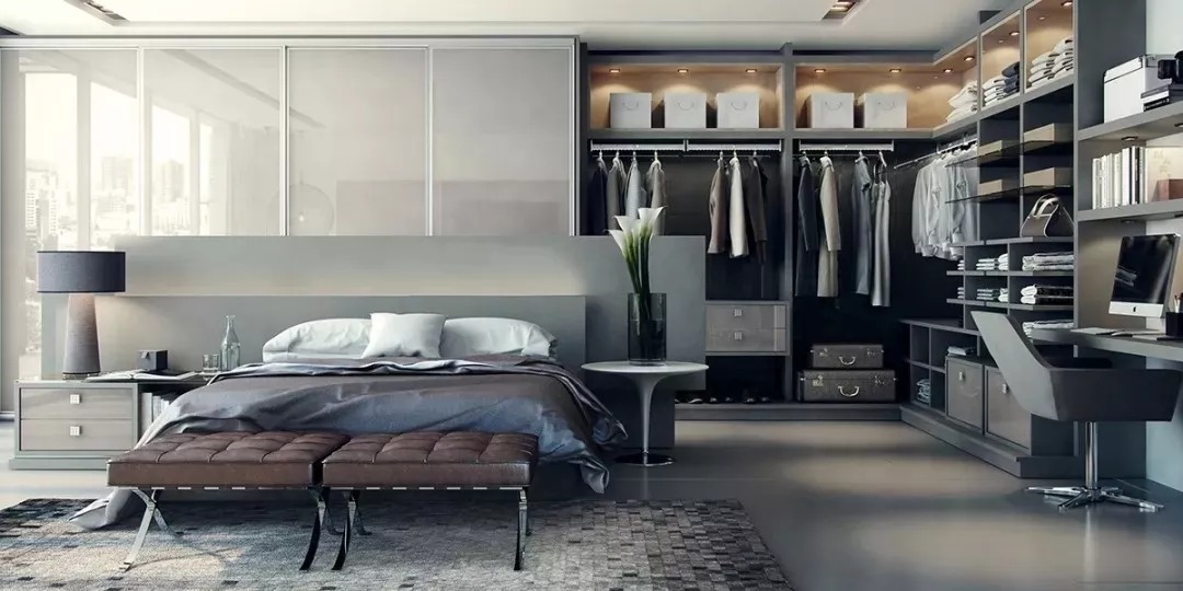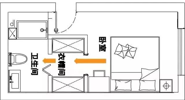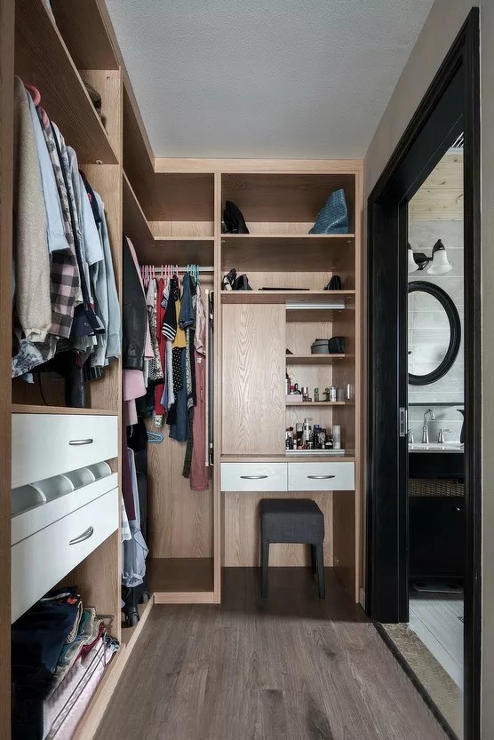最常見的是,衣帽間與衛(wèi)生間共用同一個入口,早晨起來從臥室到衣帽間換衣服再到衛(wèi)生間洗漱,一氣呵成。